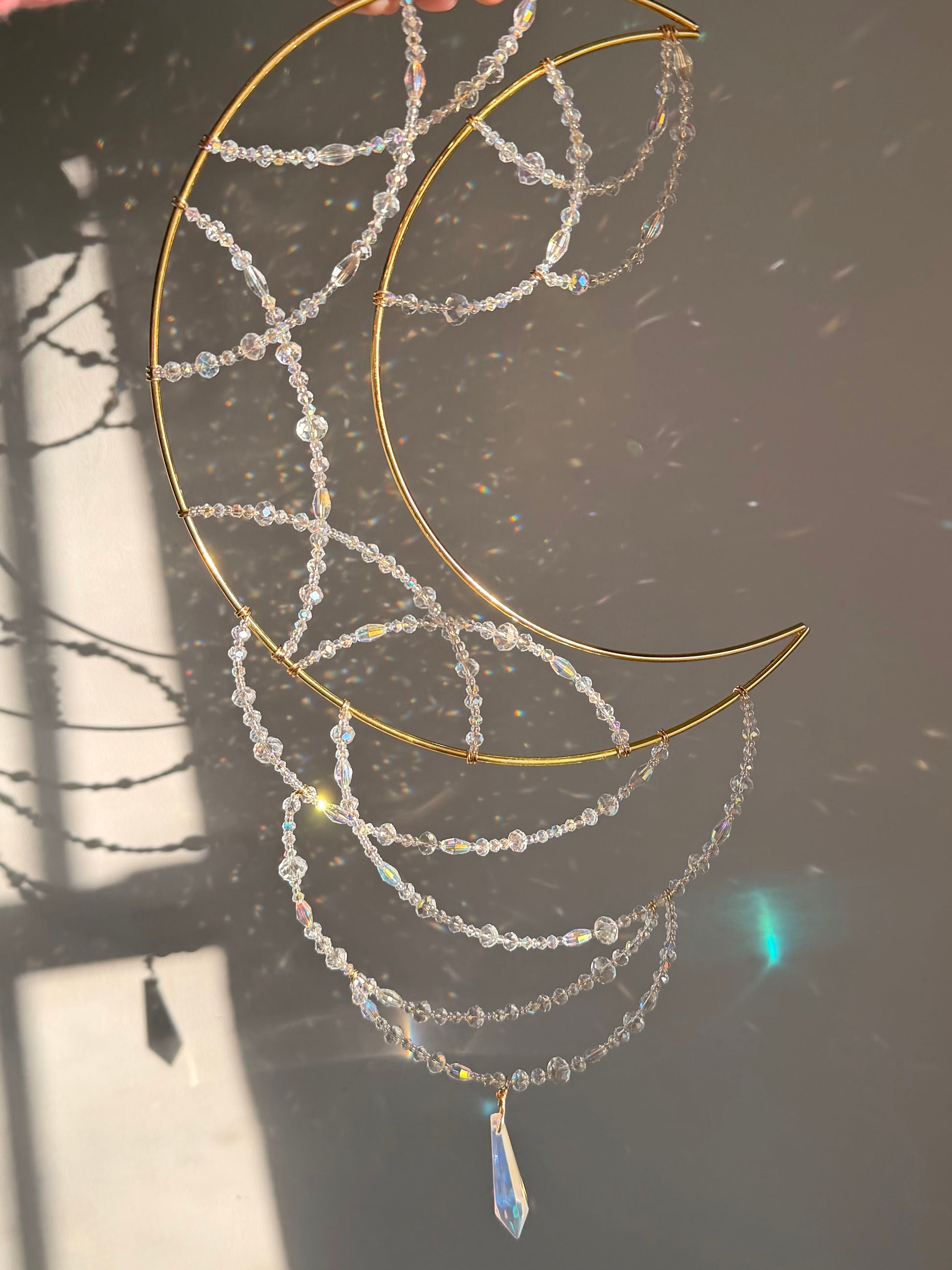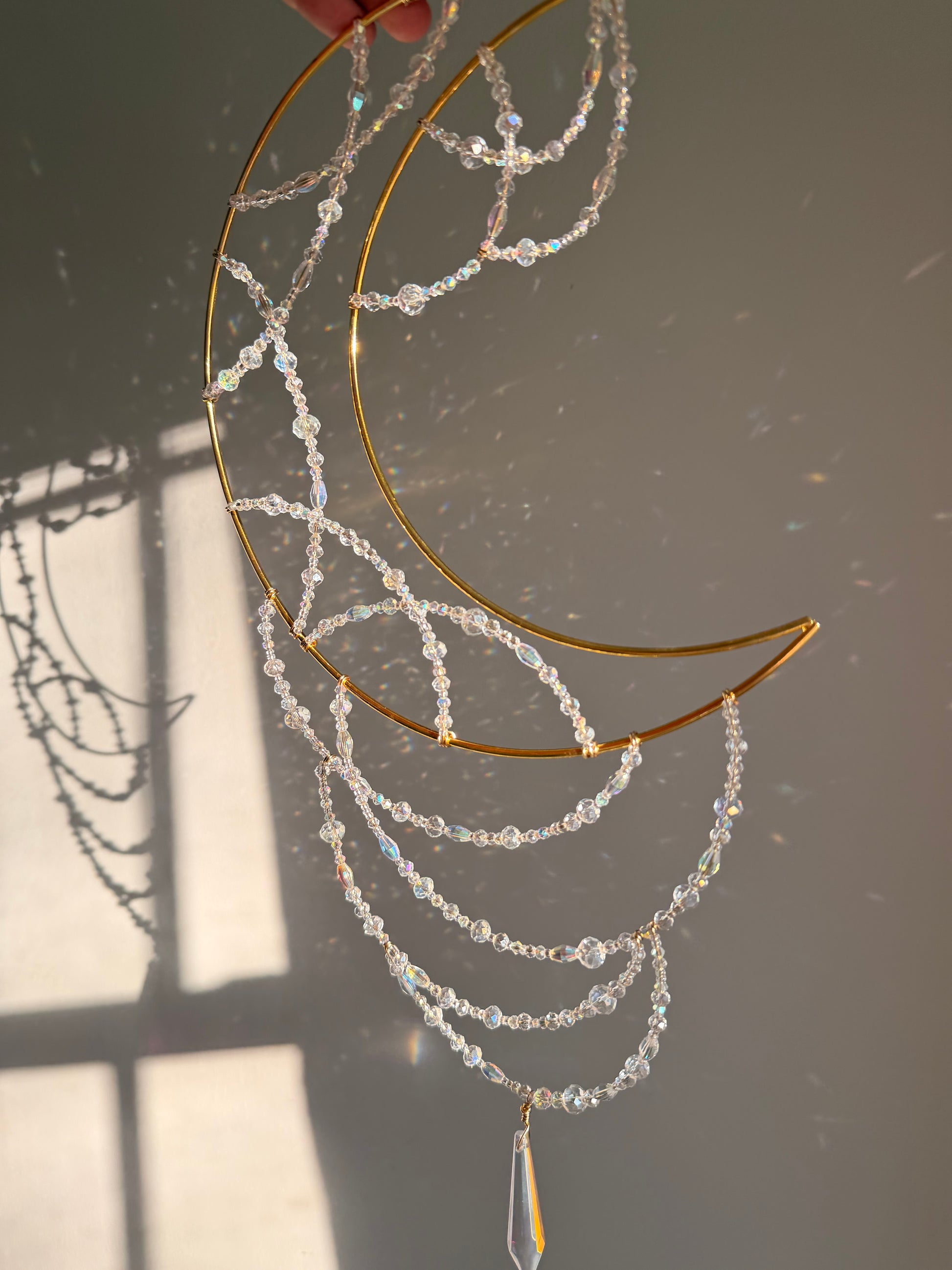 A single gold crescent moon forms the foundation, delicately wrapped and draped with strands of luminous clear crystals. The web-like structure flows downward into a faceted crystal prism, designed to scatter soft rainbow light throughout your space as the sun moves.