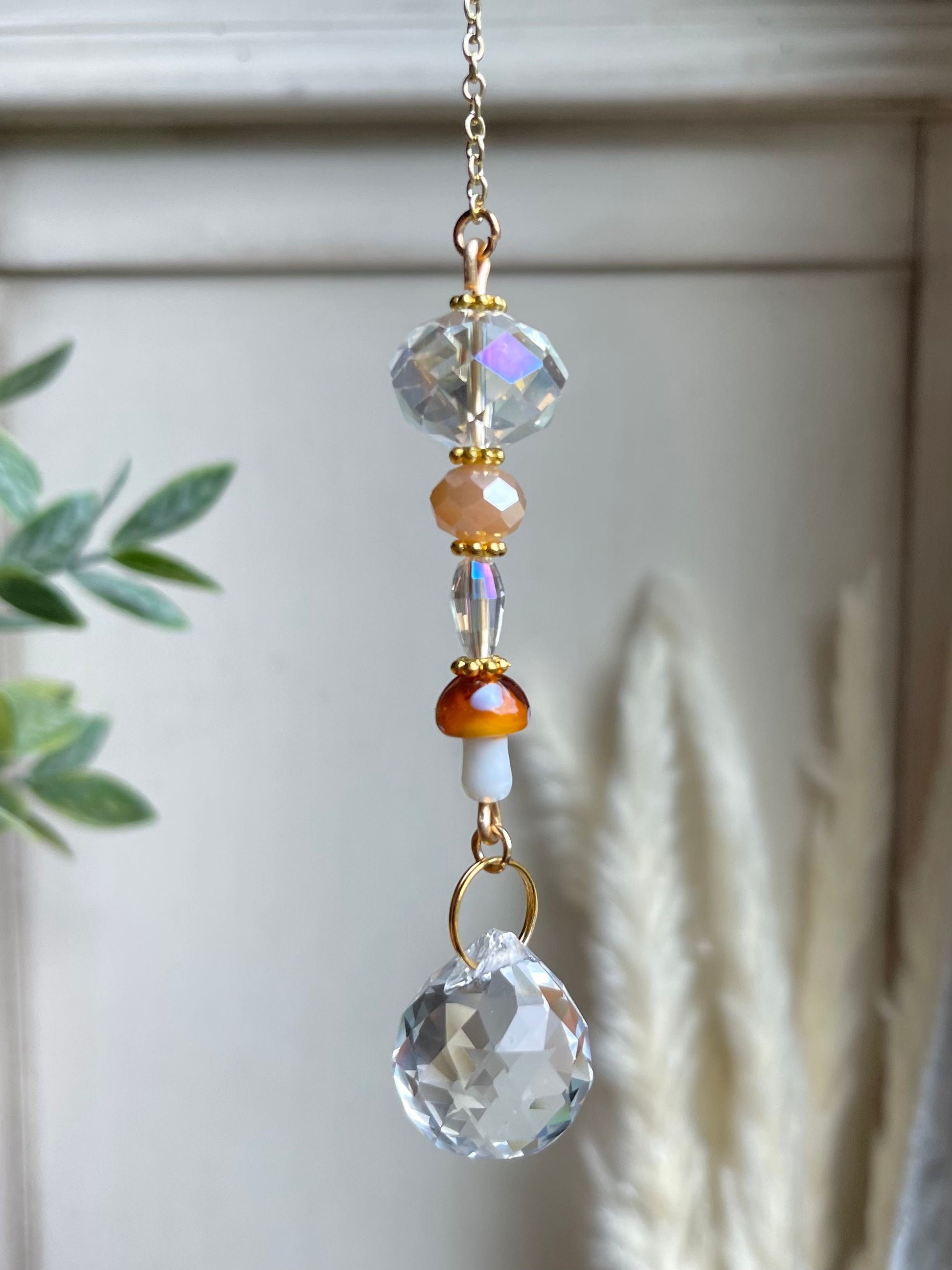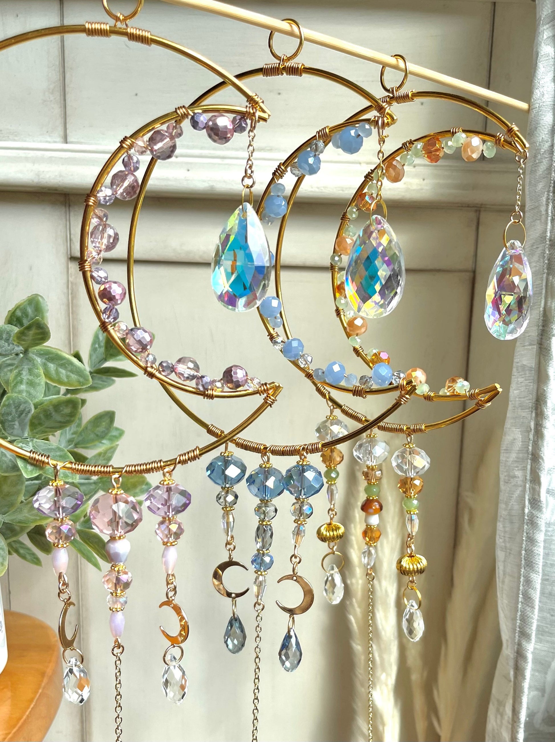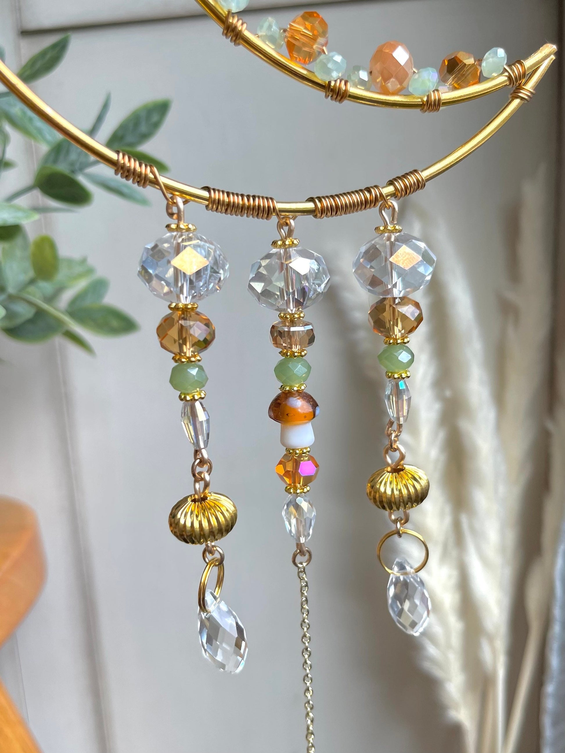 Materials: handing crystal,window decor,gold beads,light prism,ceramic mushroom,crystal art,blue beads,blue glass,orange and green,pink beads,moon frame,brass frame,copper wire