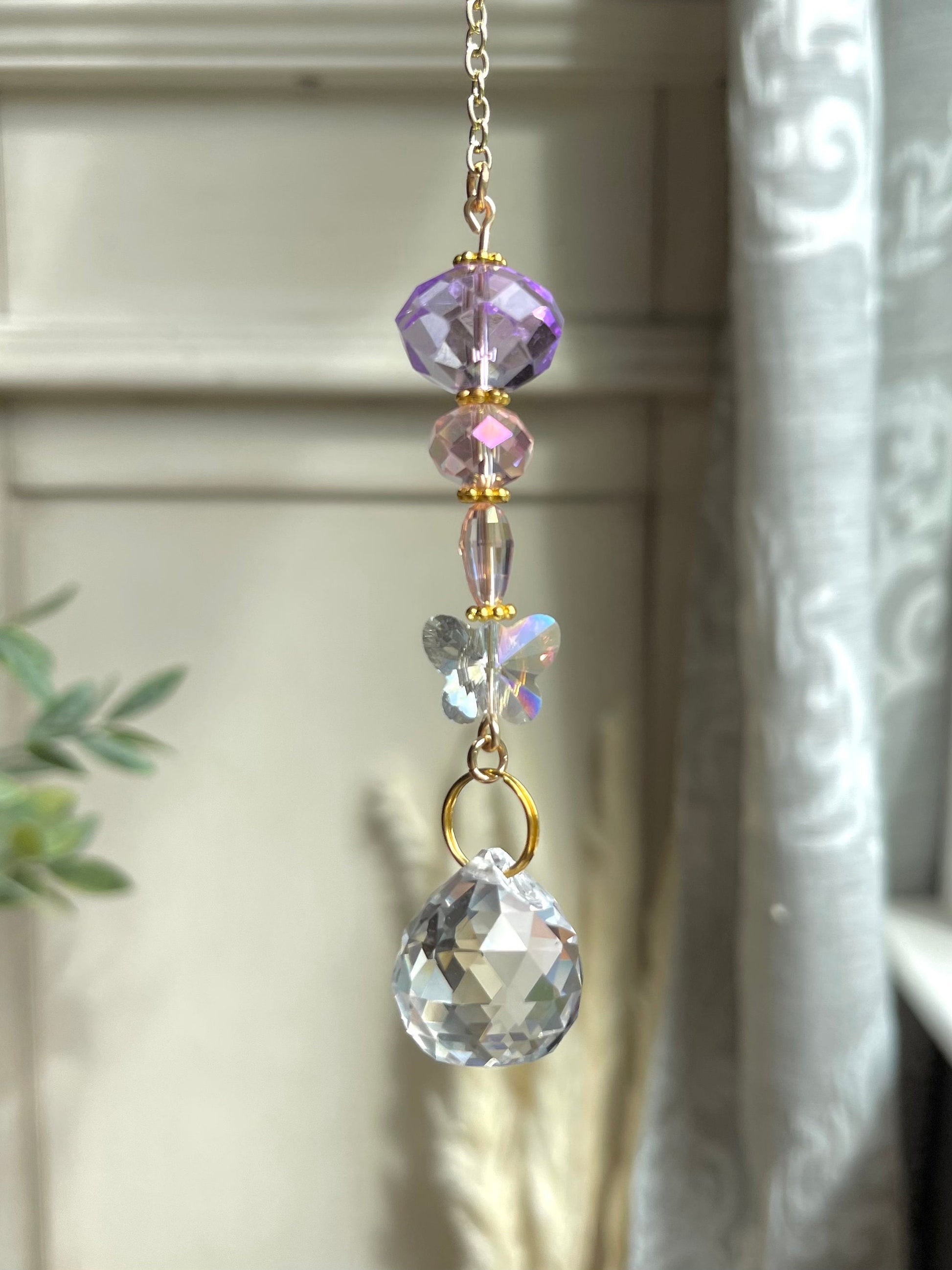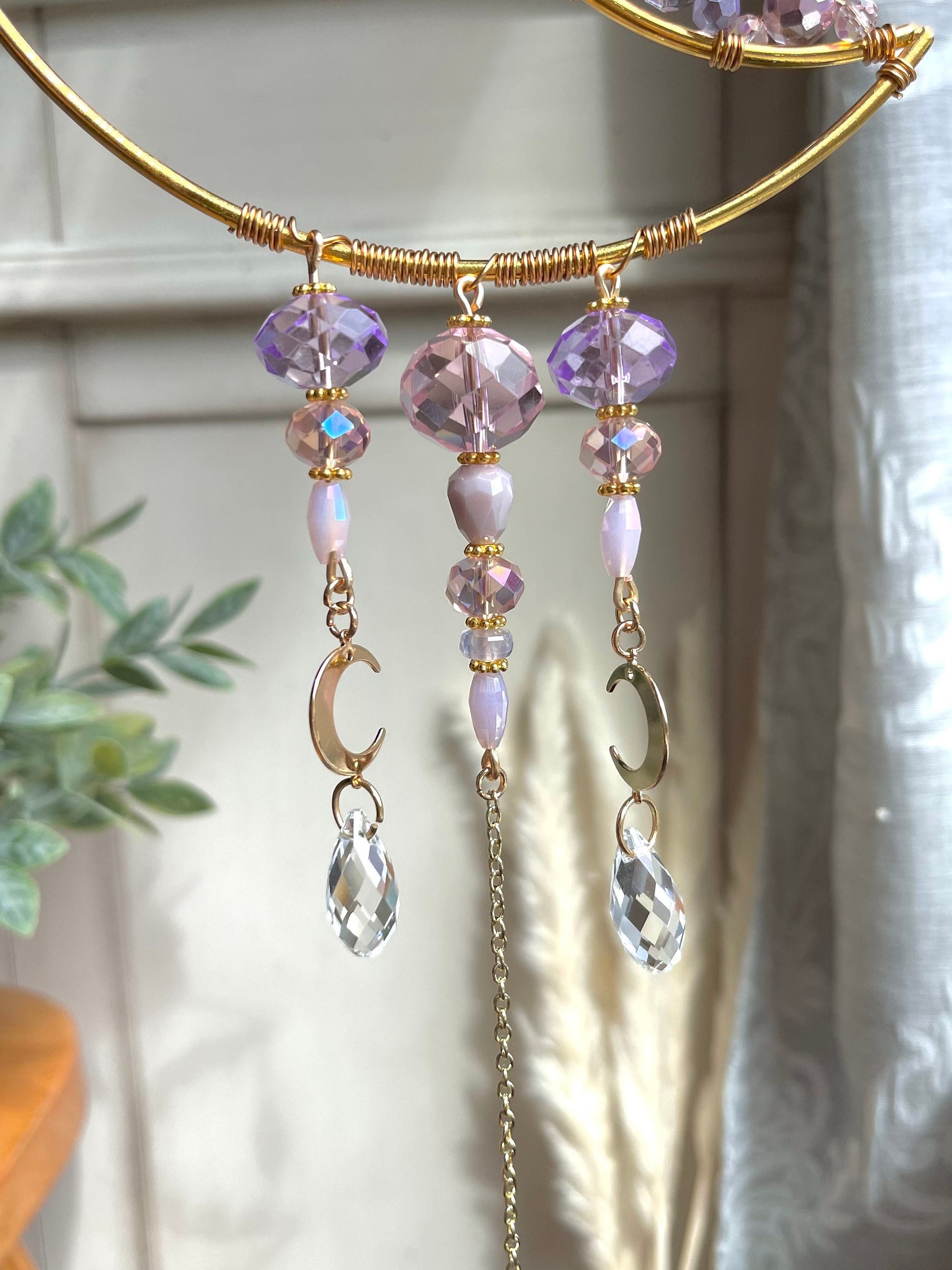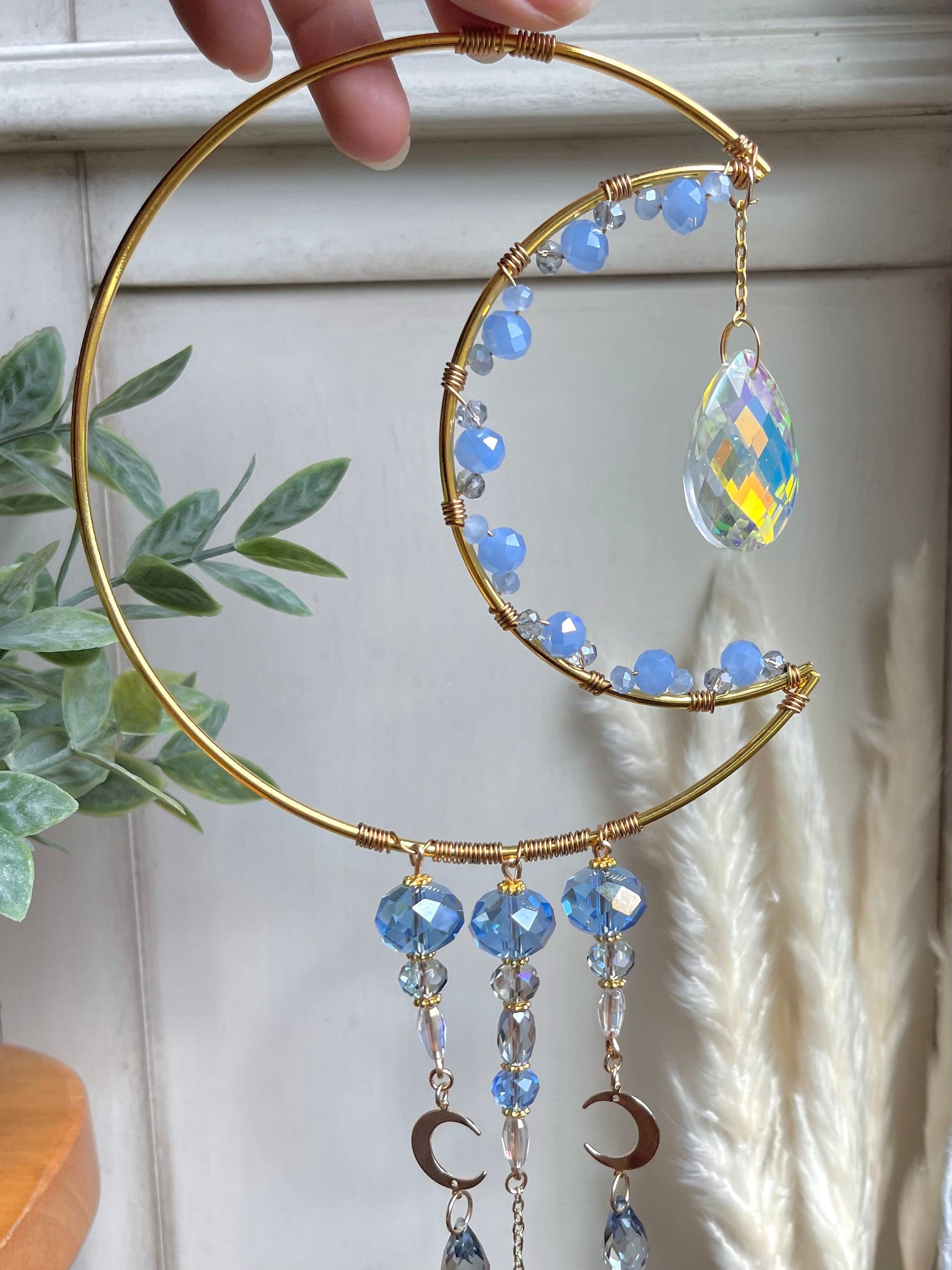 Materials: handing crystal,window decor,gold beads,light prism,ceramic mushroom,crystal art,blue beads,blue glass,orange and green,pink beads,moon frame,brass frame,copper wire