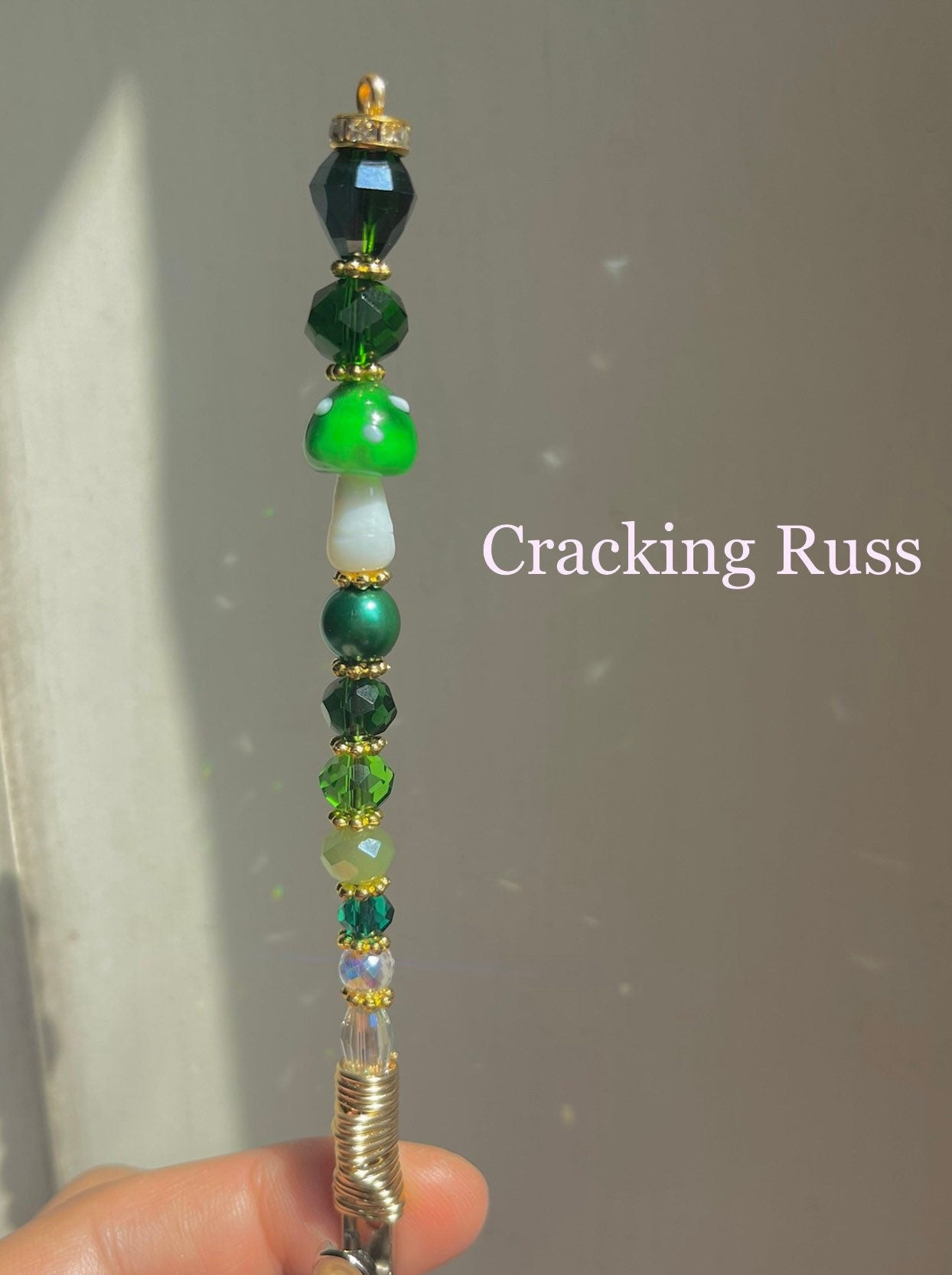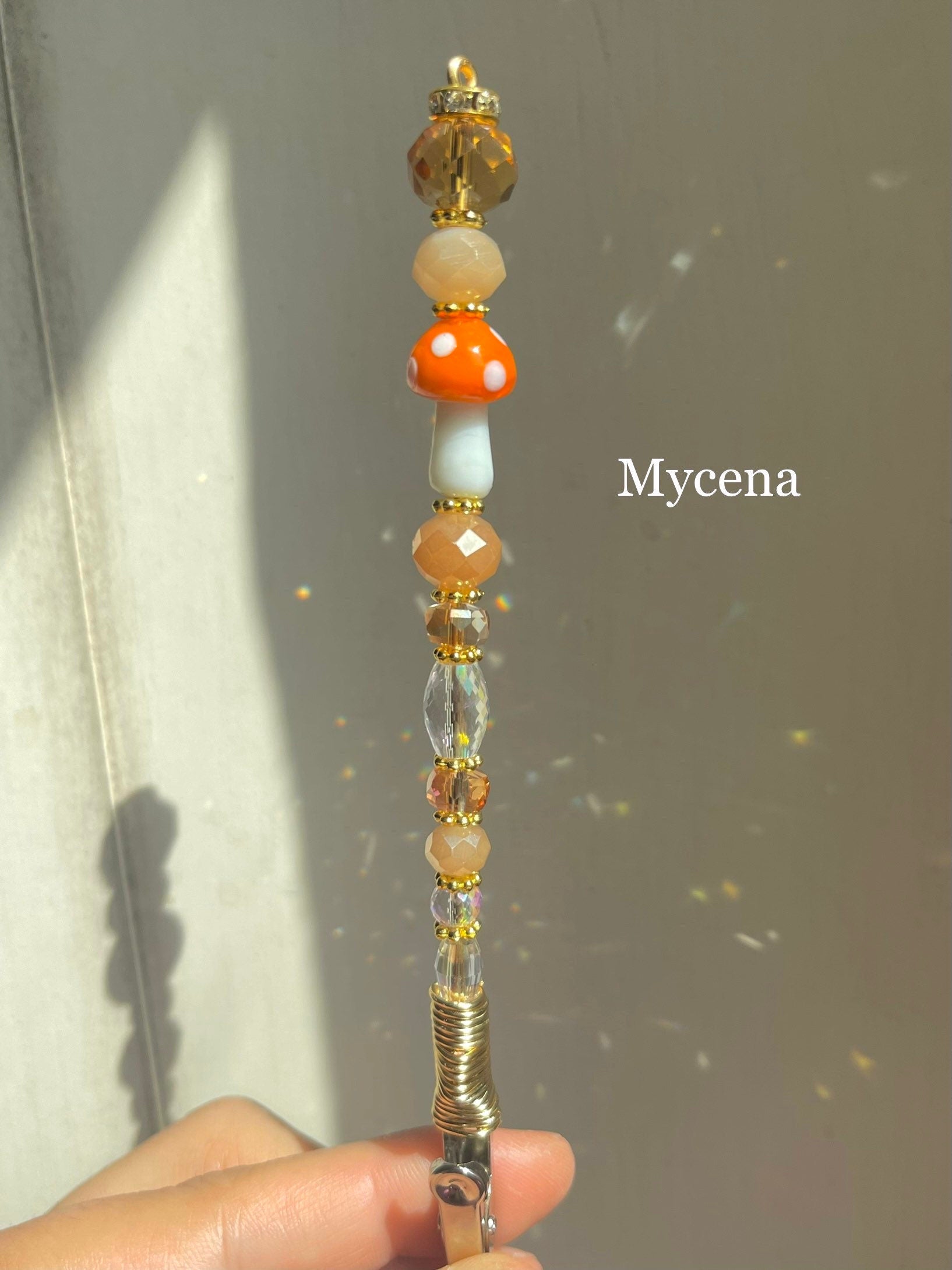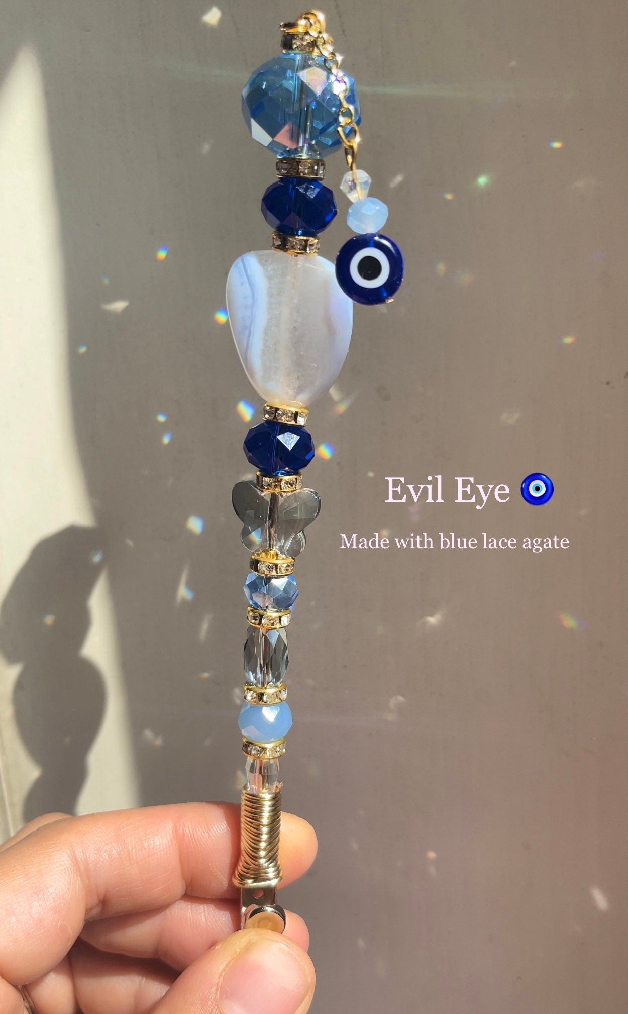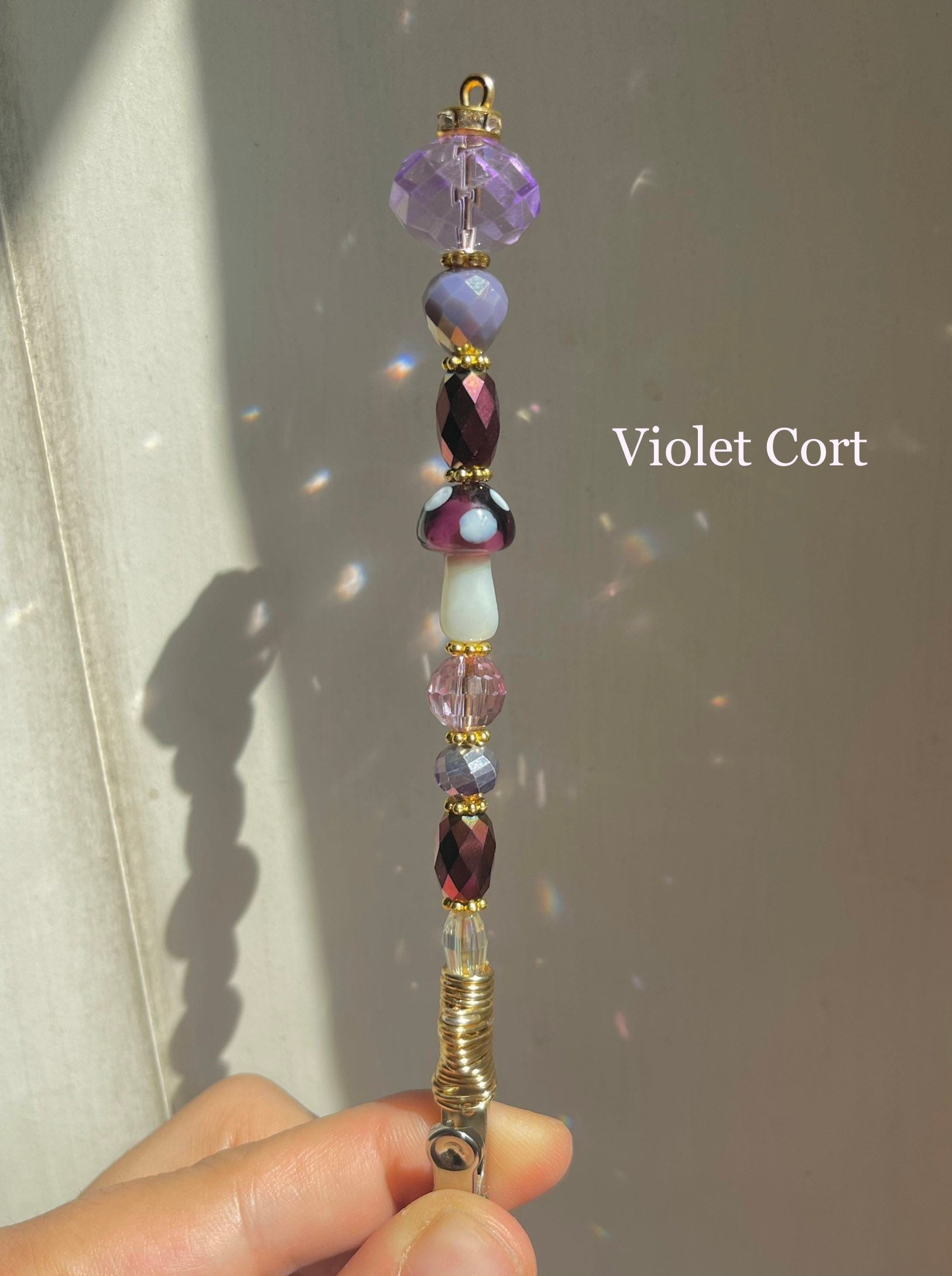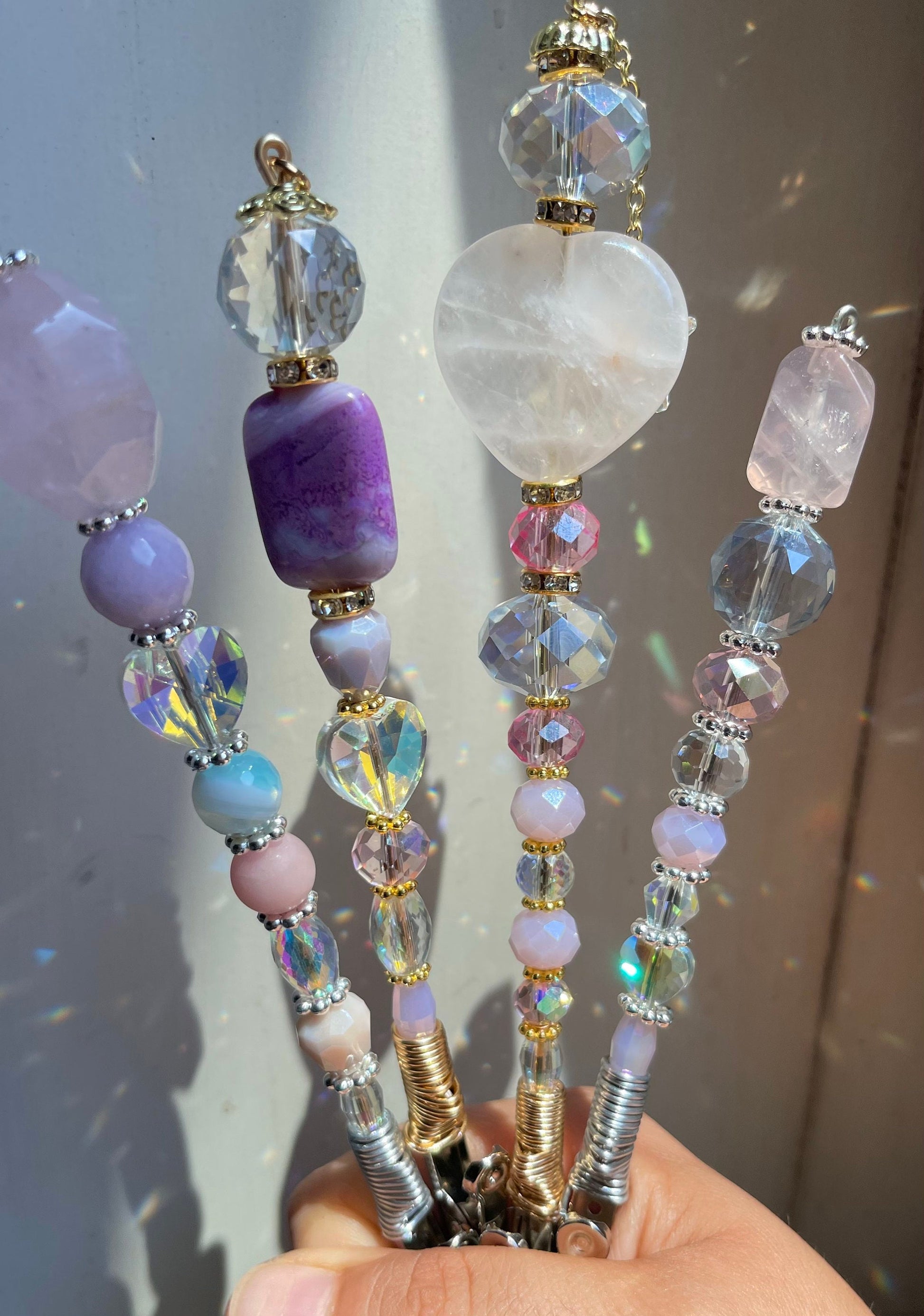Materials: black crystal,cigarette accessorie,magic wand,rainbow maker,pink agate,amethyst,purple crystal,ceramic beads,mushroom clip,blue lace agate,copper wire wrap,glass beads,rose Quartz