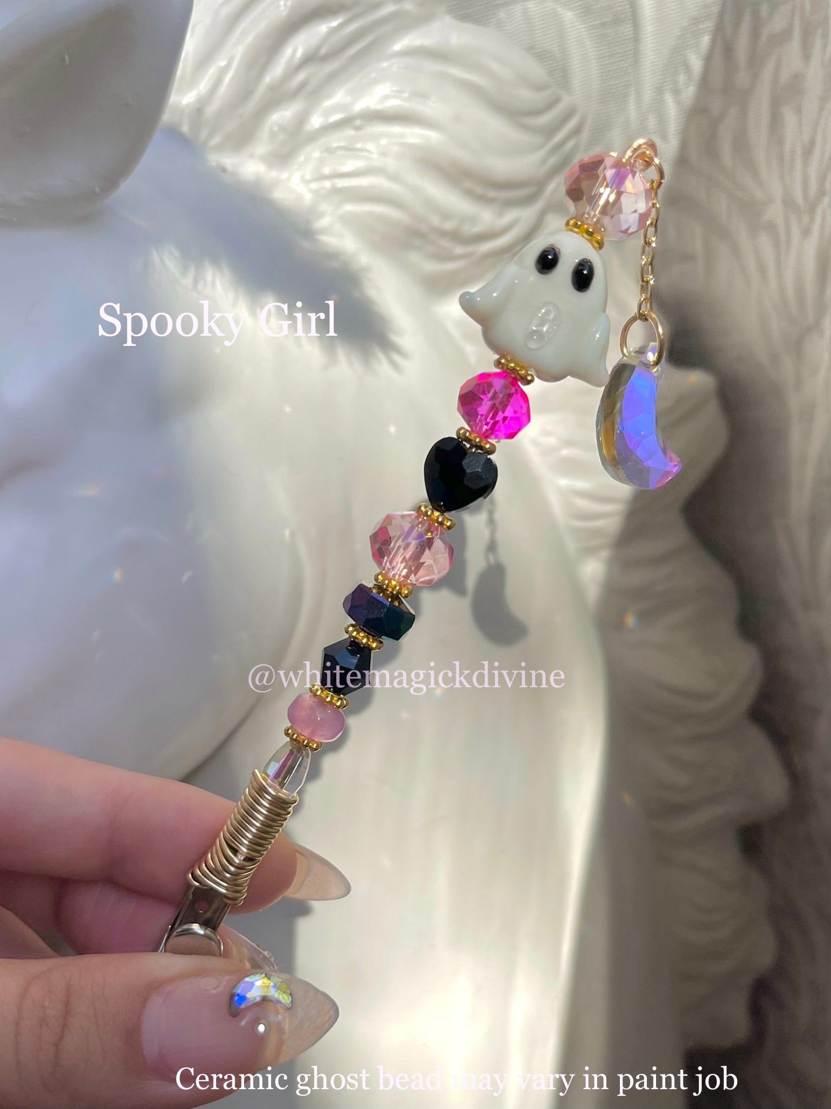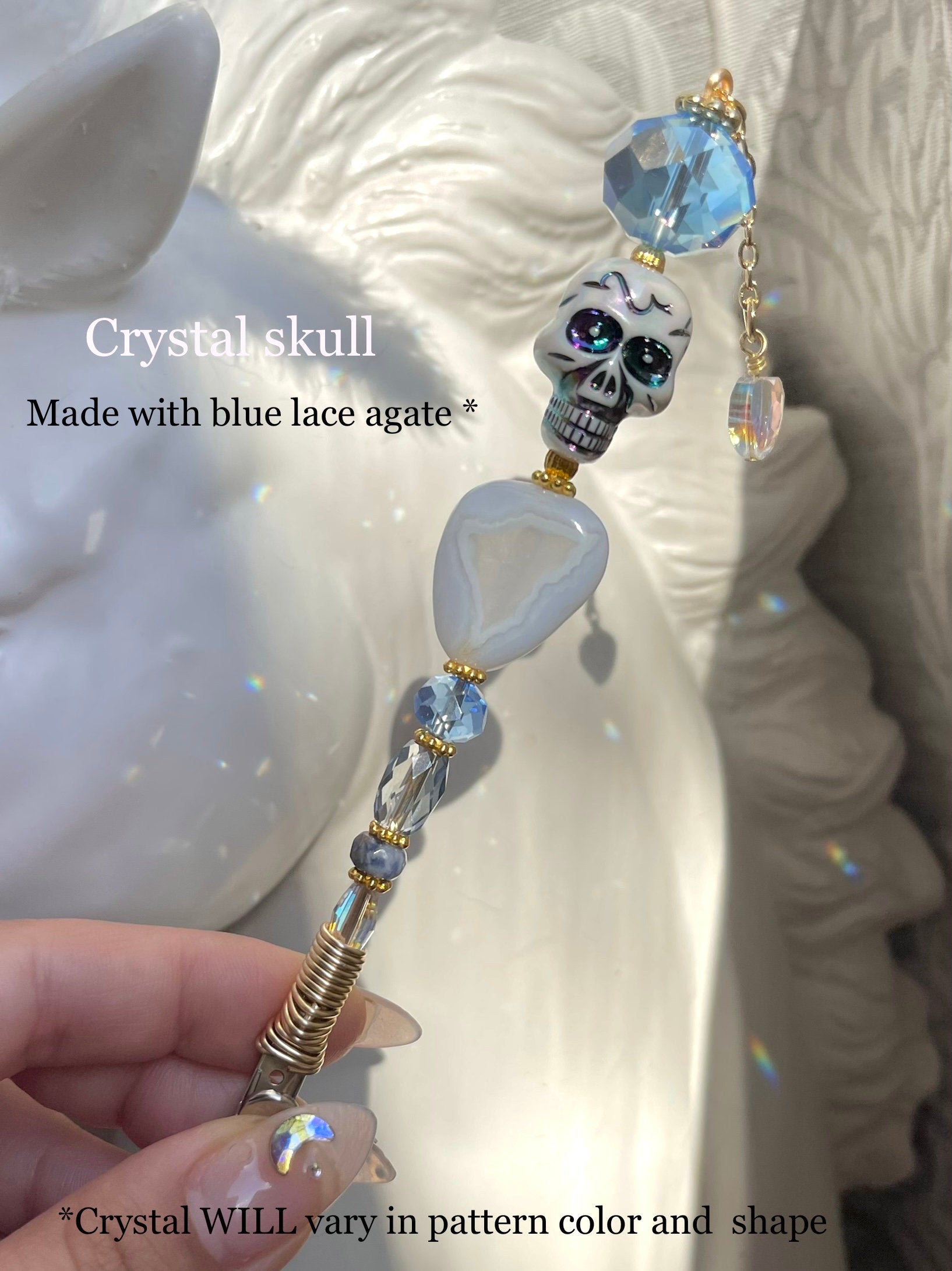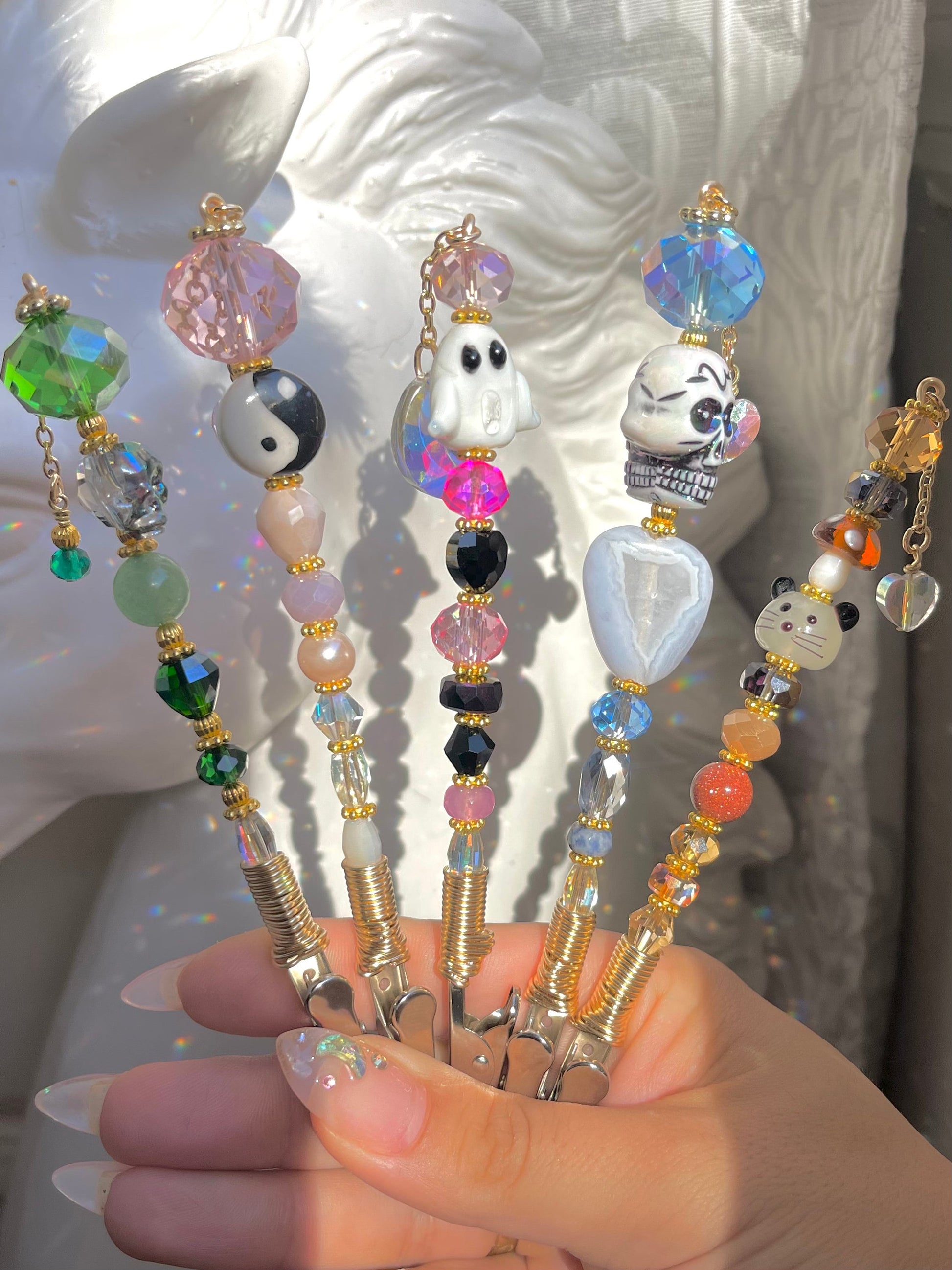 Materials: jade,wire wrap crystal,crystal charm,crystal wand,chrysoprase,blue lace agate,rose Quartz,Ocean Jasper,Fairy wand,Ying Yang,Mouse charm,Skull charm,Ghost charm