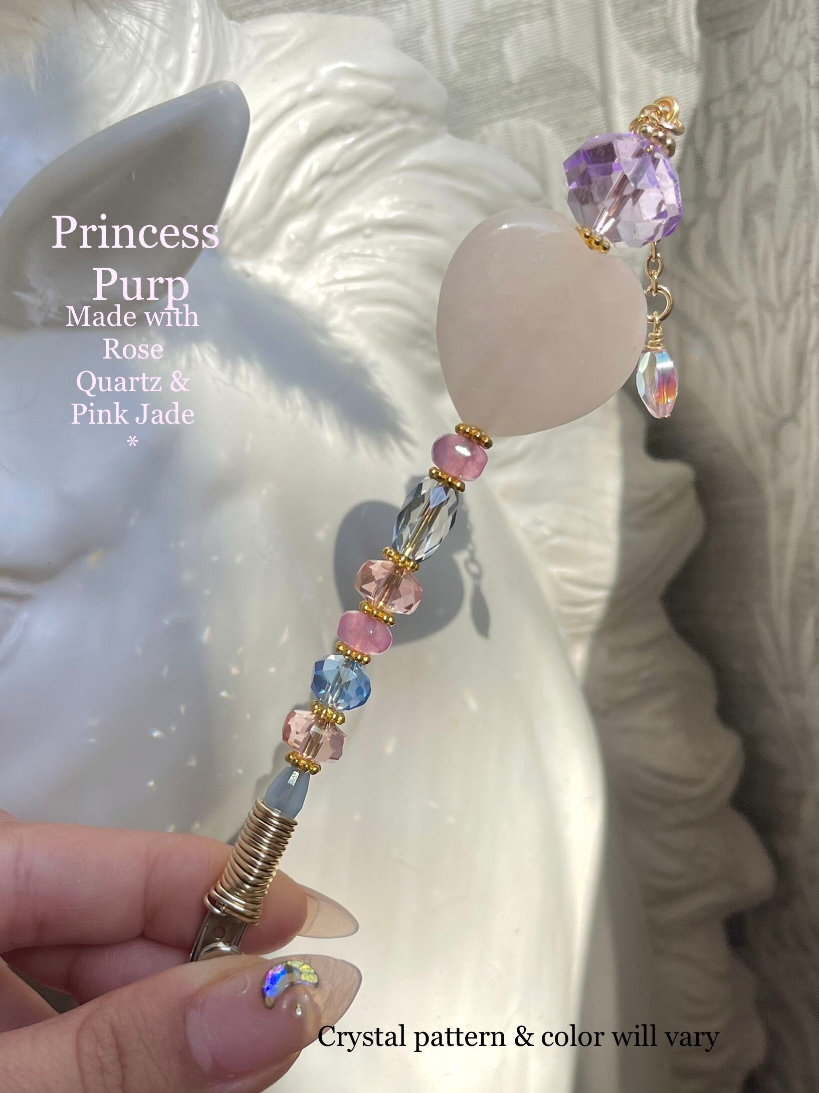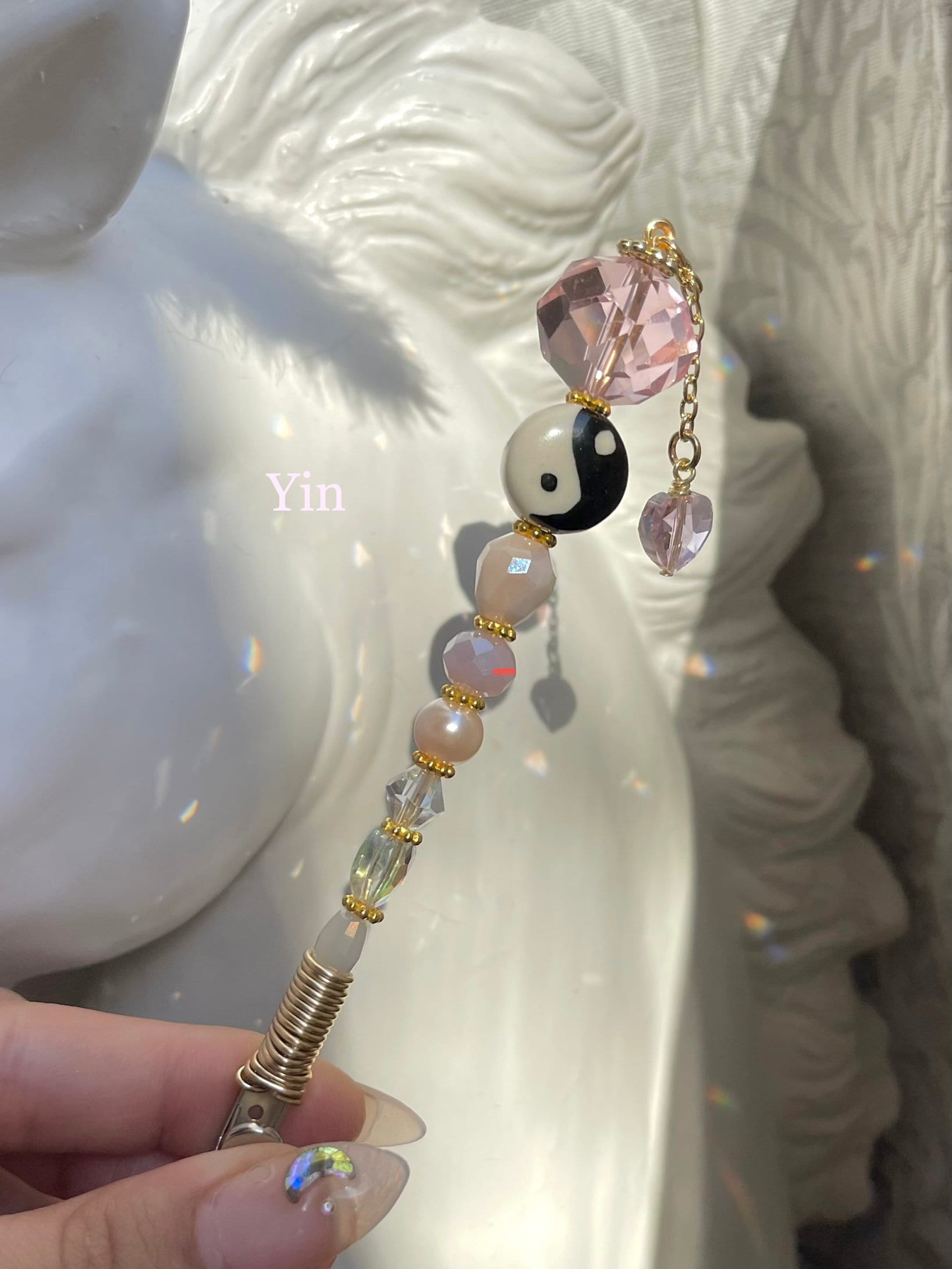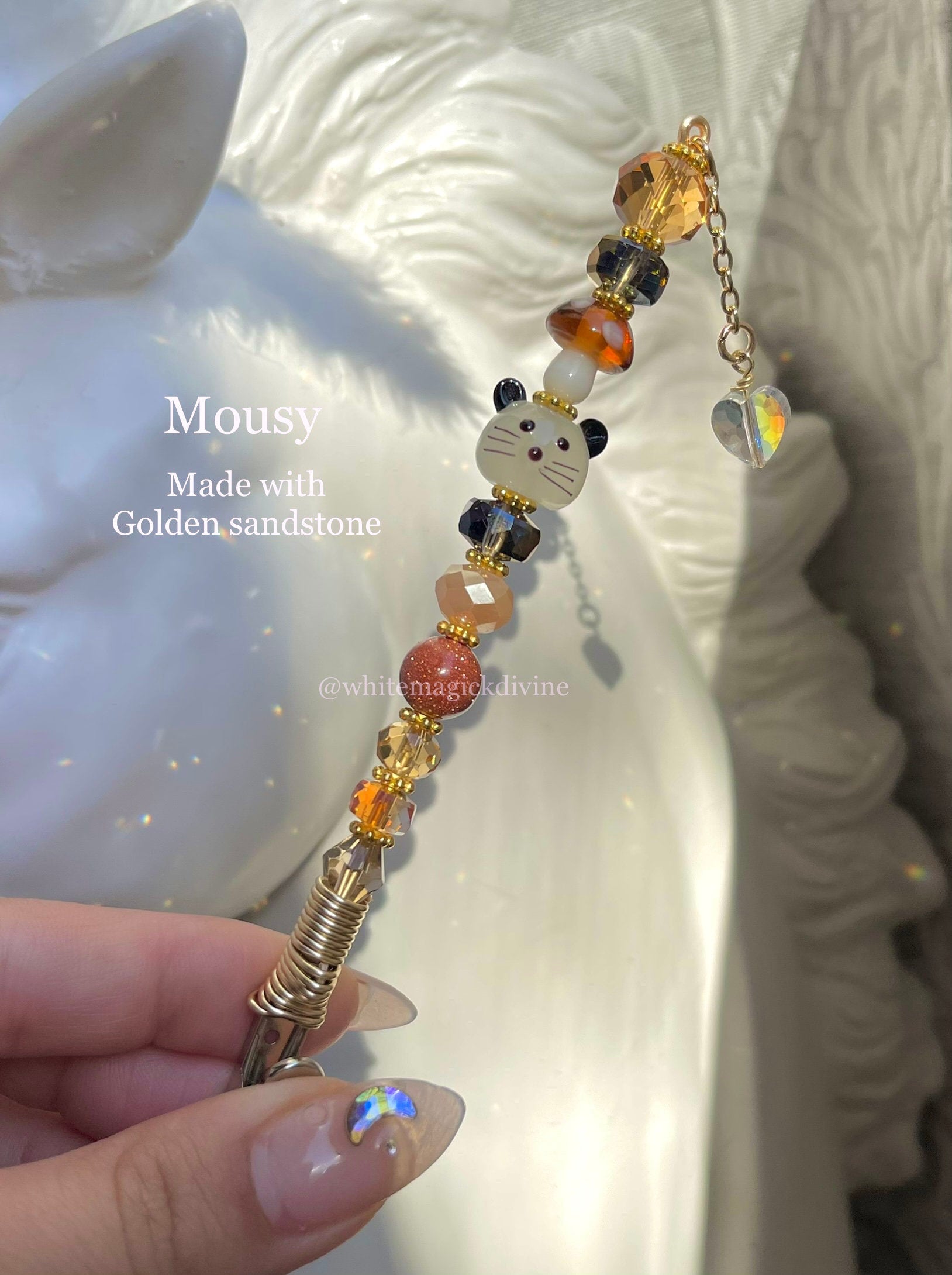 Materials: jade,wire wrap crystal,crystal charm,crystal wand,chrysoprase,blue lace agate,rose Quartz,Ocean Jasper,Fairy wand,Ying Yang,Mouse charm,Skull charm,Ghost charm