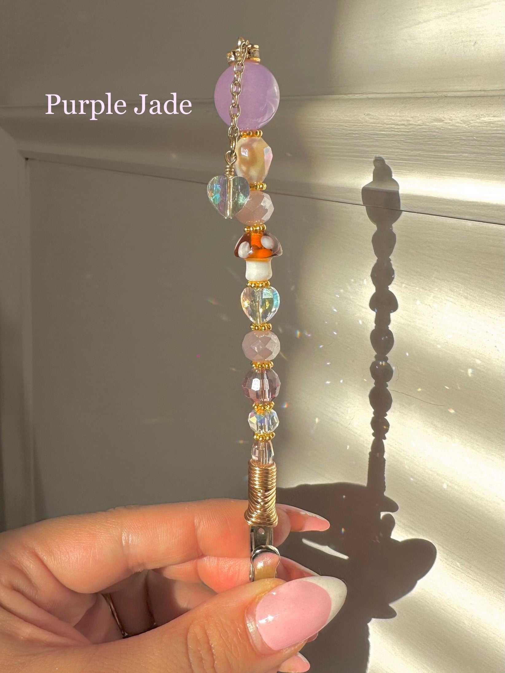Materials: faceted beads,clip,pink pearl,rainbow maker,dangles,purple tiger eye,strawberry charm,purple jade,leaf charm,pink jade,copper wire,glass beads,Mushroom beads