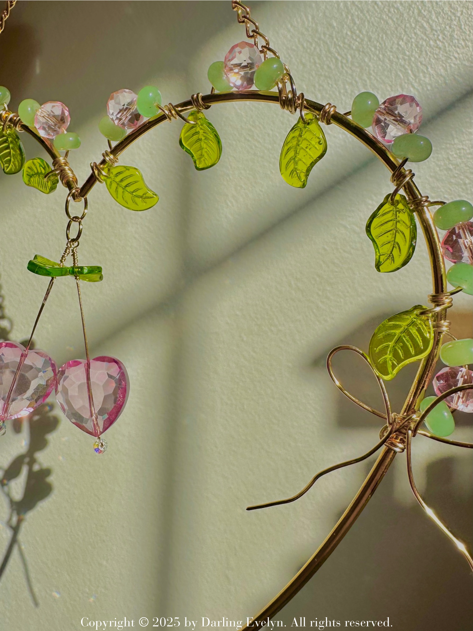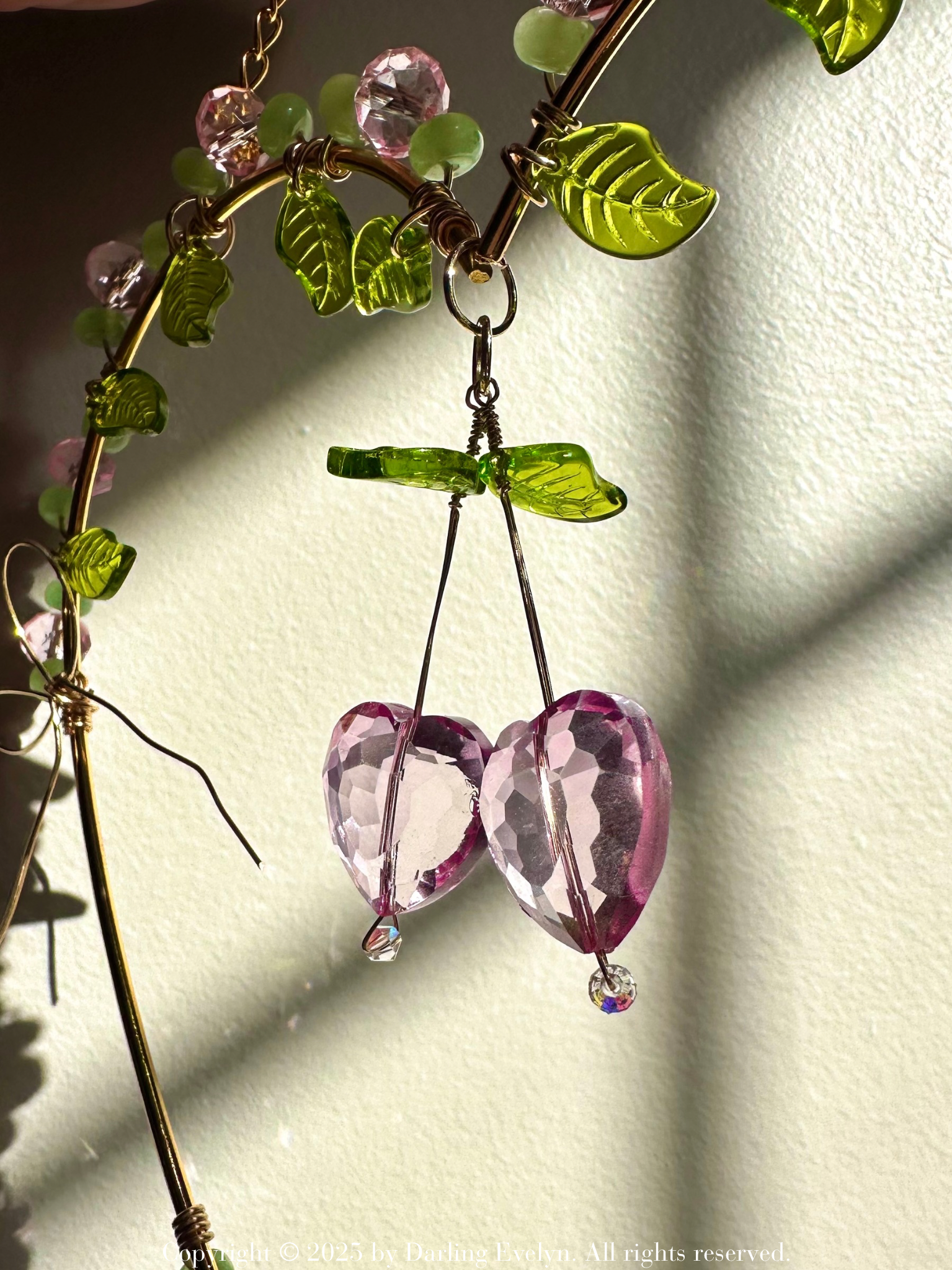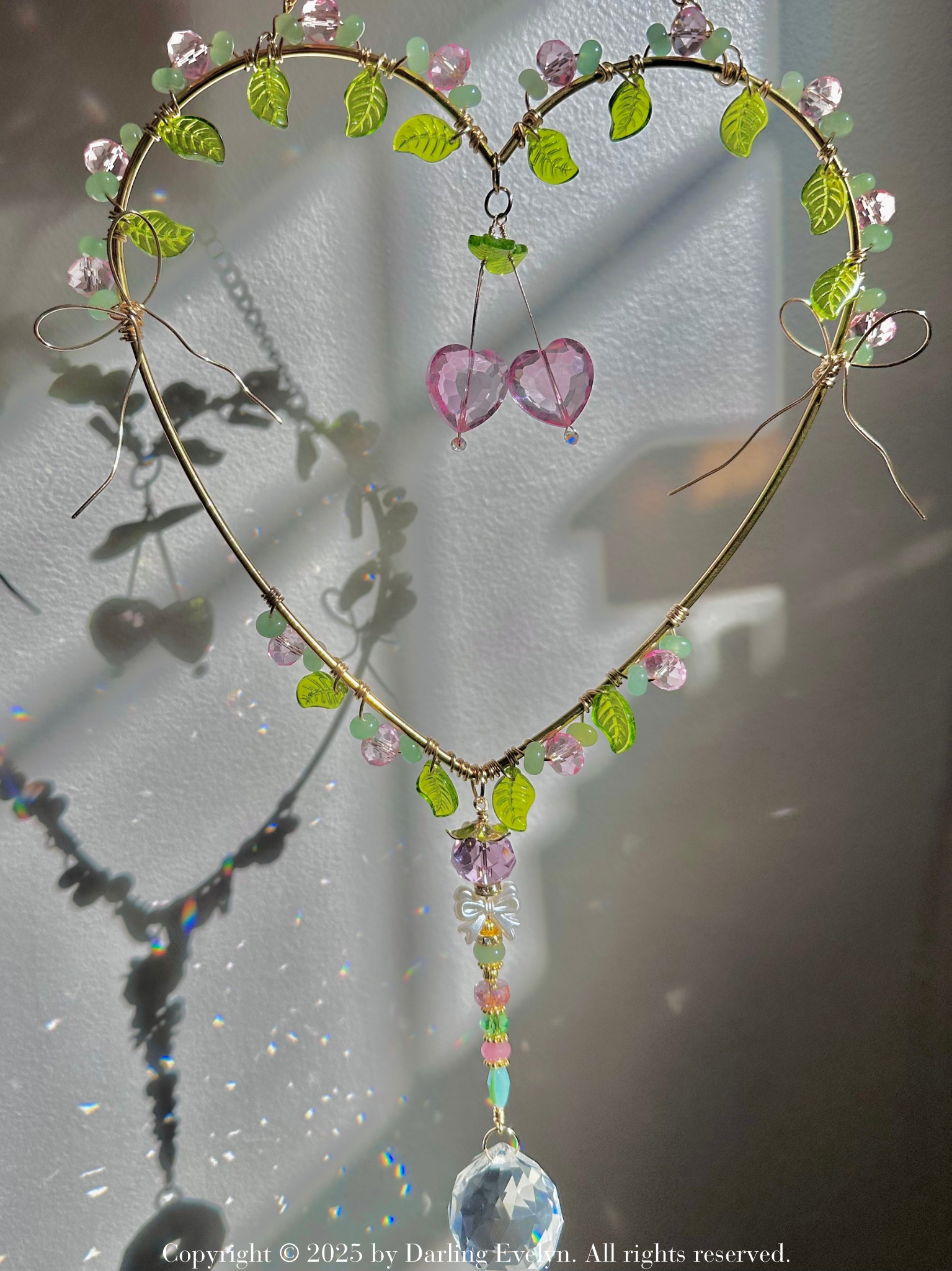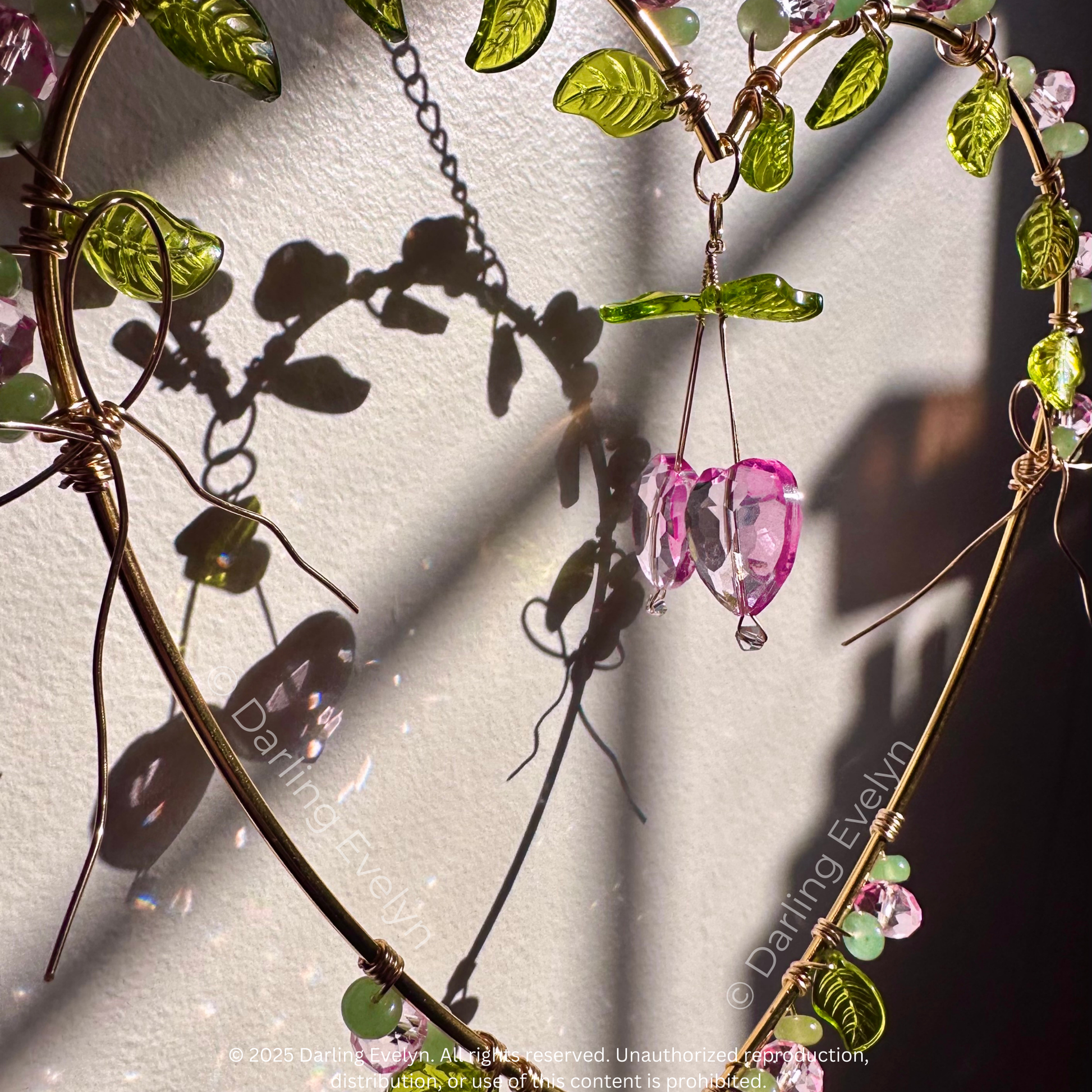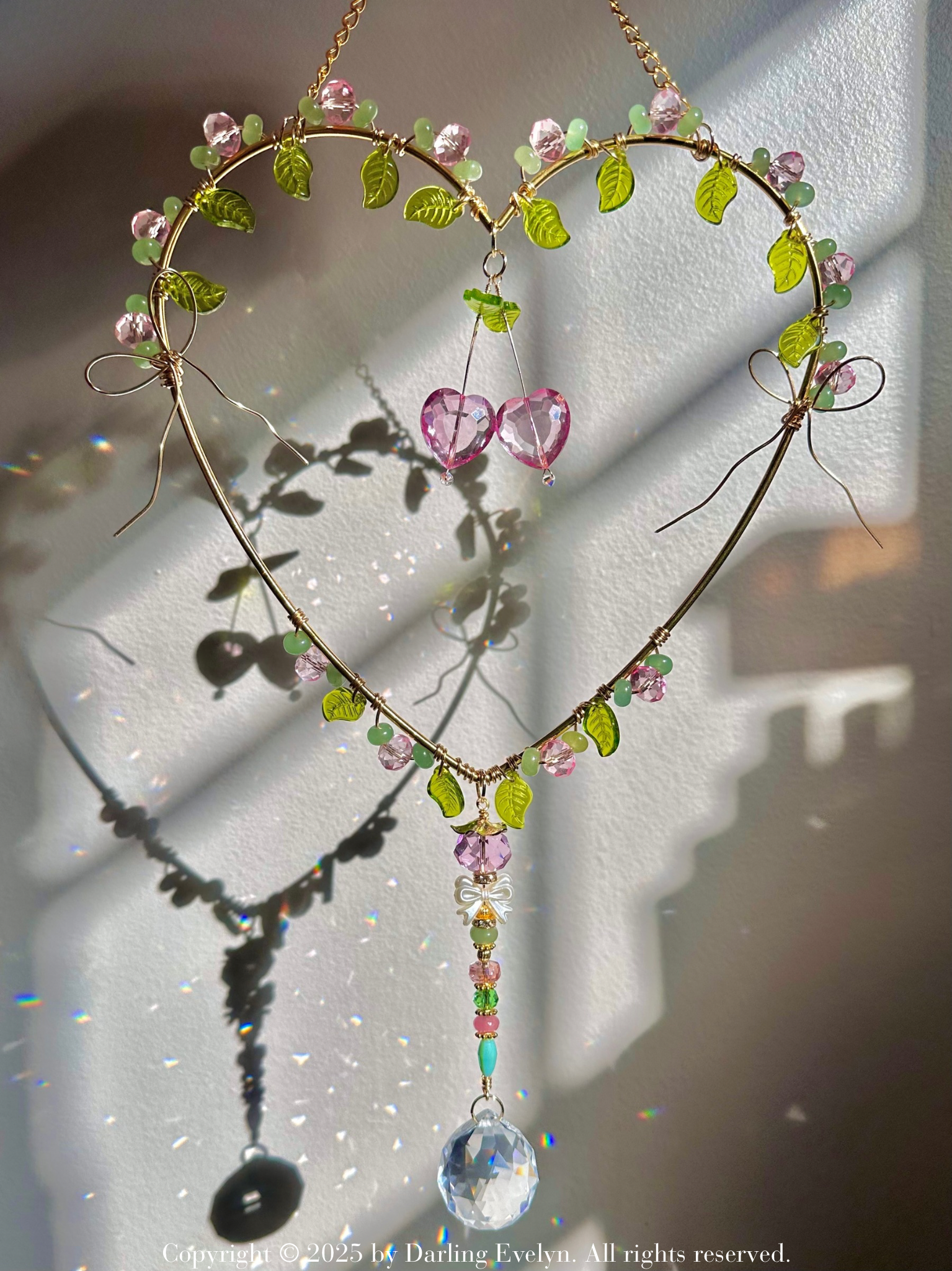 Handmade Heart Crystal Cherry Suncatcher – Natural Green Jade & Glass Beads