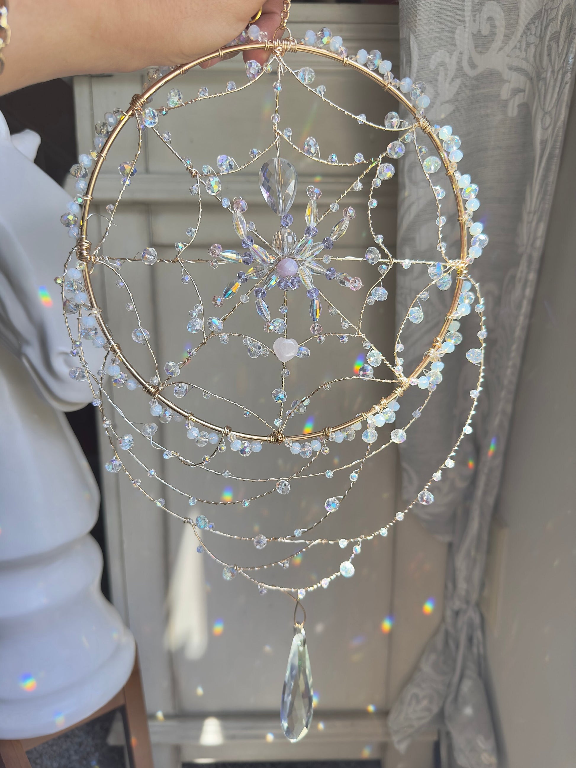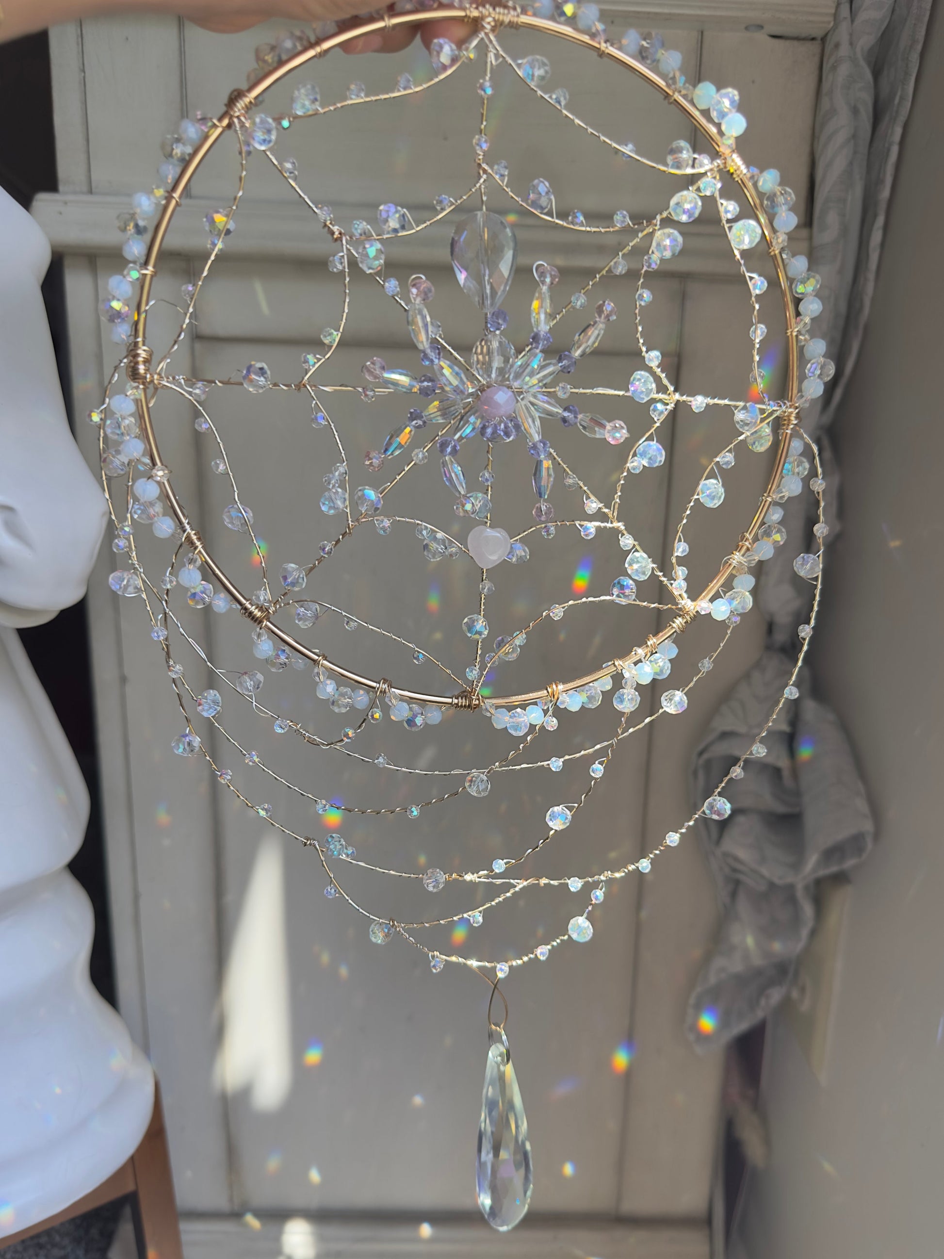 This suncatcher features a combination of exquisite materials including AB crystals, copper wire, opalite, Rose Quartz, and opalite. The AB crystals sparkle with a prism-like effect, reflecting light in a dazzling display. The copper wire adds a touch of elegance and durability to the design, while the opalite and Rose Quartz infuse the piece with their calming and loving energy.